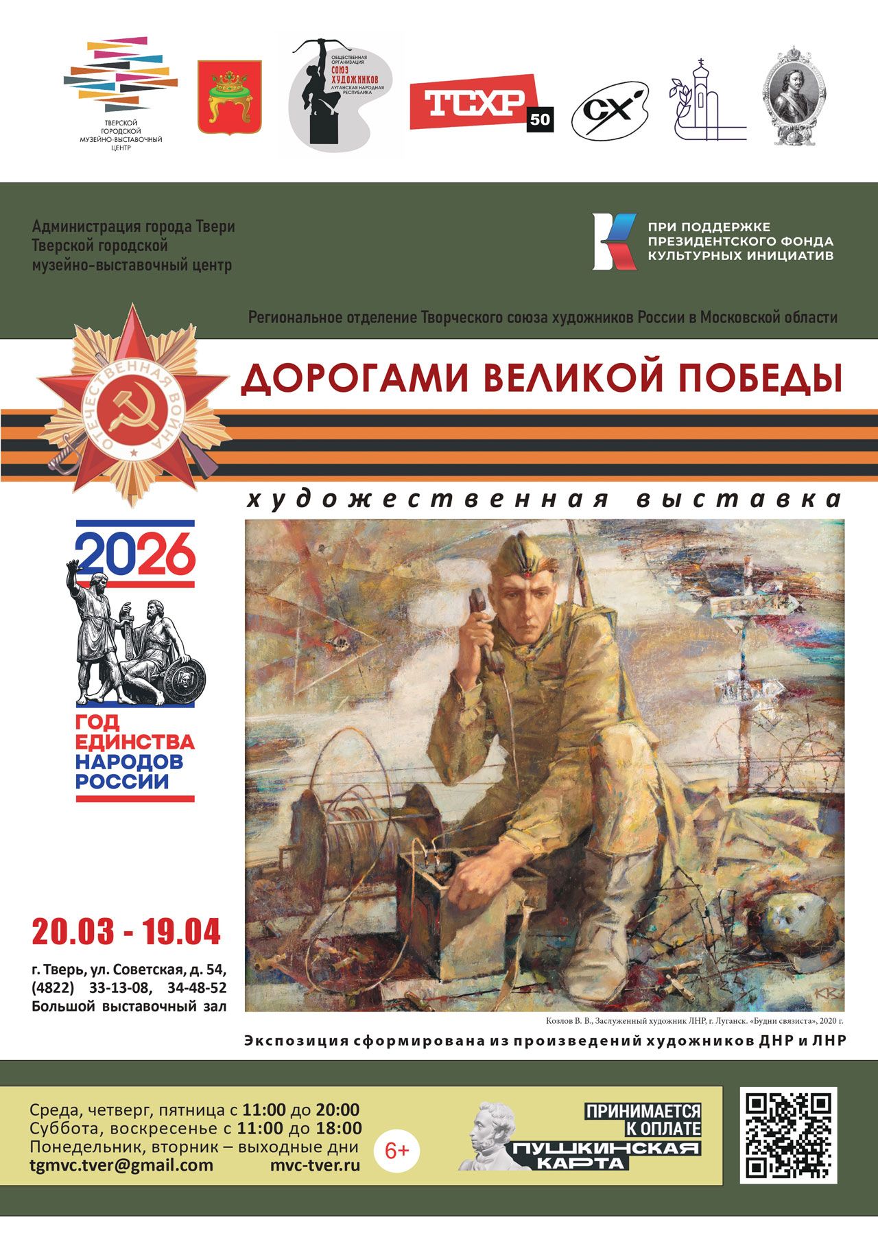 Настоящий проект осуществляется при поддержке Президентского фонда культурных инициатив. Проект является партнерским и реализуется совместно с Союзом художников ДНР, Союзом художников ЛНР, Тверским отделением Петровской академии наук и искусств, «Фондом культурных инициатив» Московской области, Фондом социально-культурных инициатив Донбасса. В рамках проекта были проведены выставки, посвященные 80-летию Победы в Великой Отечественной войне художников из Московской, Тверской областей в Донецкой и Луганской Народных Республиках, а художников из Донецкой и Луганской Народных Республик, – в Московской области.